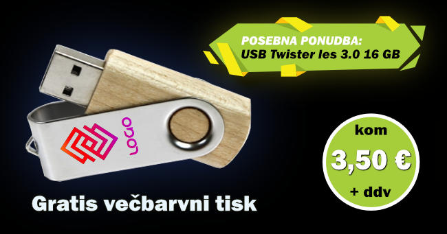| Ta cena velja samo za model Twister les v svetli izvedbi, kapacitete 16 GB, verzija 3.0. Minimalno naročilo: 25 kosov. Cena ne vključuje DDV in dajatve po ZKUASP.